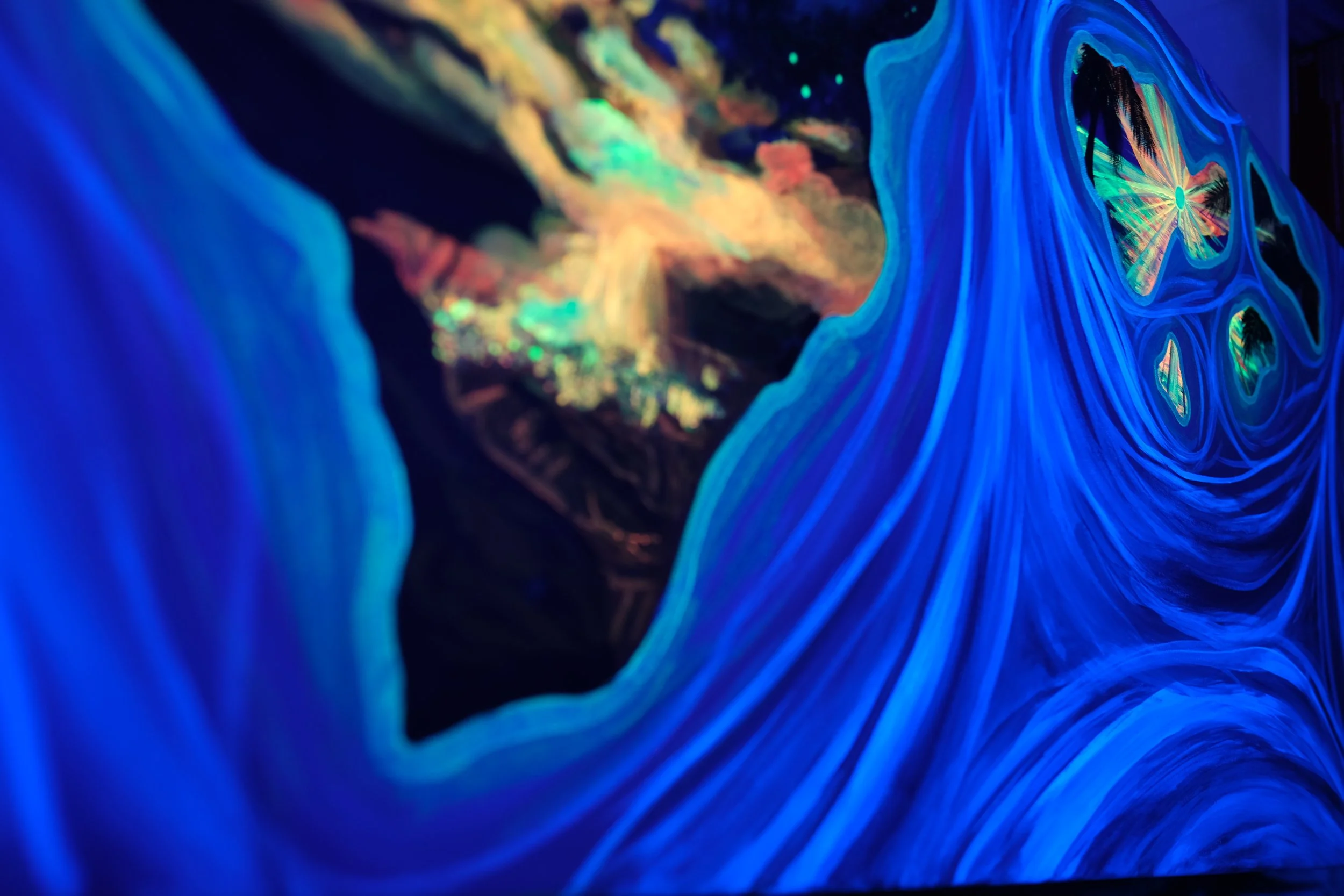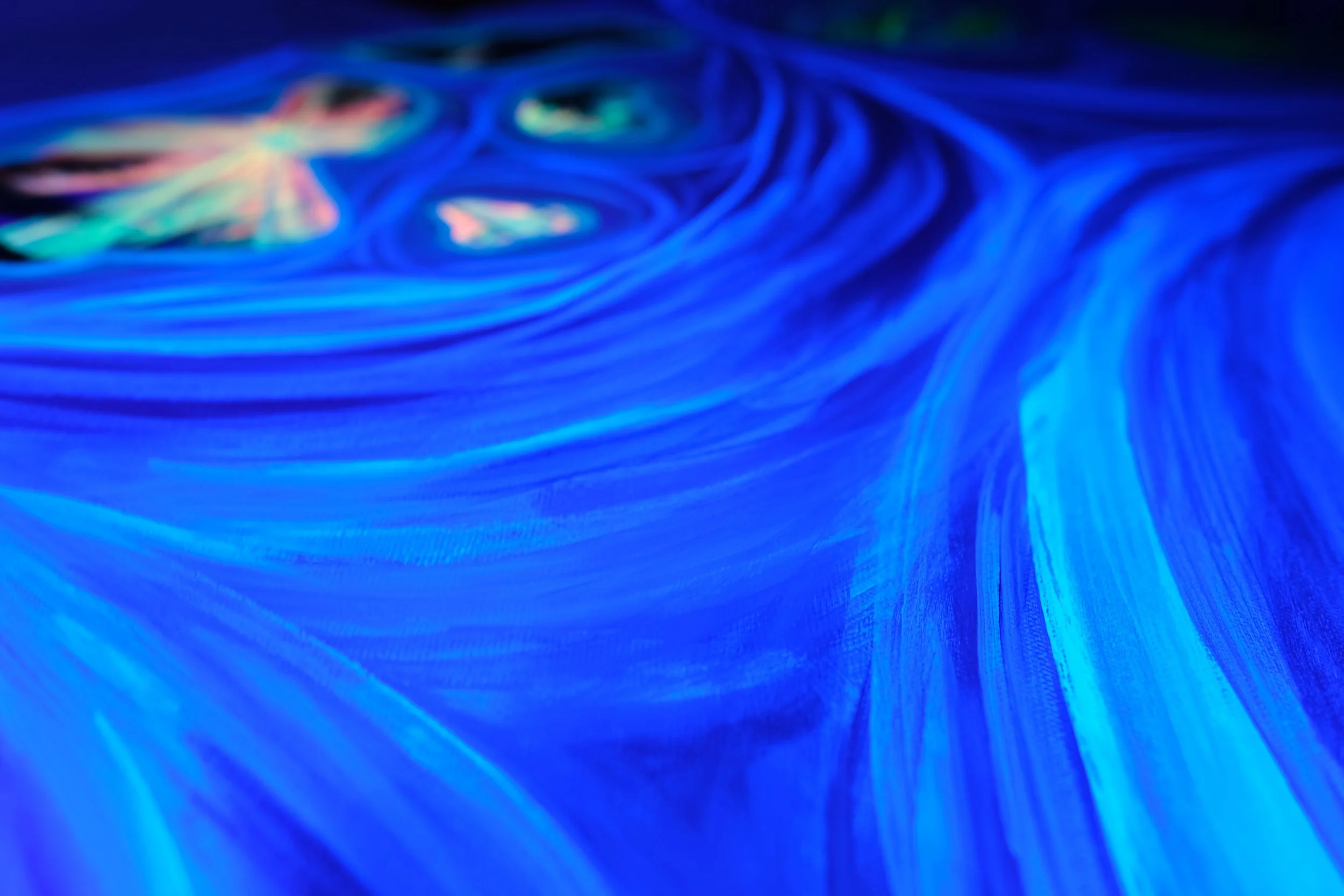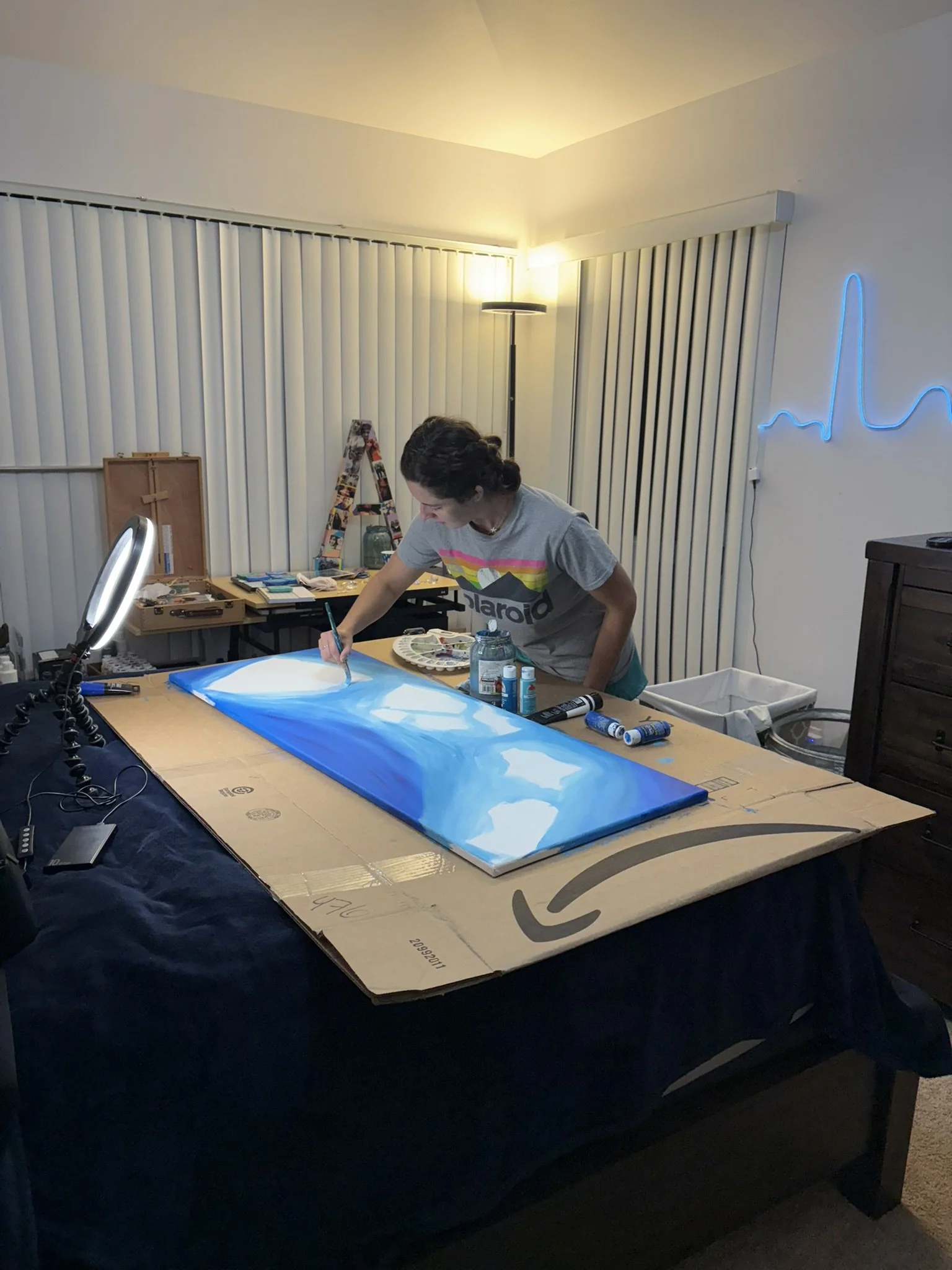 My largest custom piece yet! The commissioner had the fascinating idea for a piece where the Hawaiian islands were mirrored. He wanted to hang this painting up in his bathroom, so it would be seen in the mirror most of the time. I send them a digita sketch of how the island outlines would look. His only request was to include Tripler Hospital, which is inside of O’ahu. I painted this piece on a 4-foot by 18-inch canvas. Each island puka has a scene related to that island: the 2024 Kilauea eruption in the Big Island, a sunset view from the channels between Maui, Molokai, Lanai, and Kaho’olawe, Tripler Army Medical Center in O’ahu, and the green ridges of the fertile mountains inside of Kaua’i and Ni’ihau. I added backlight-reactive and glow in the dark paints as a surprise touch. The client and his fiancée are very happy with the piece and hung it up immediately as soon as they got home!